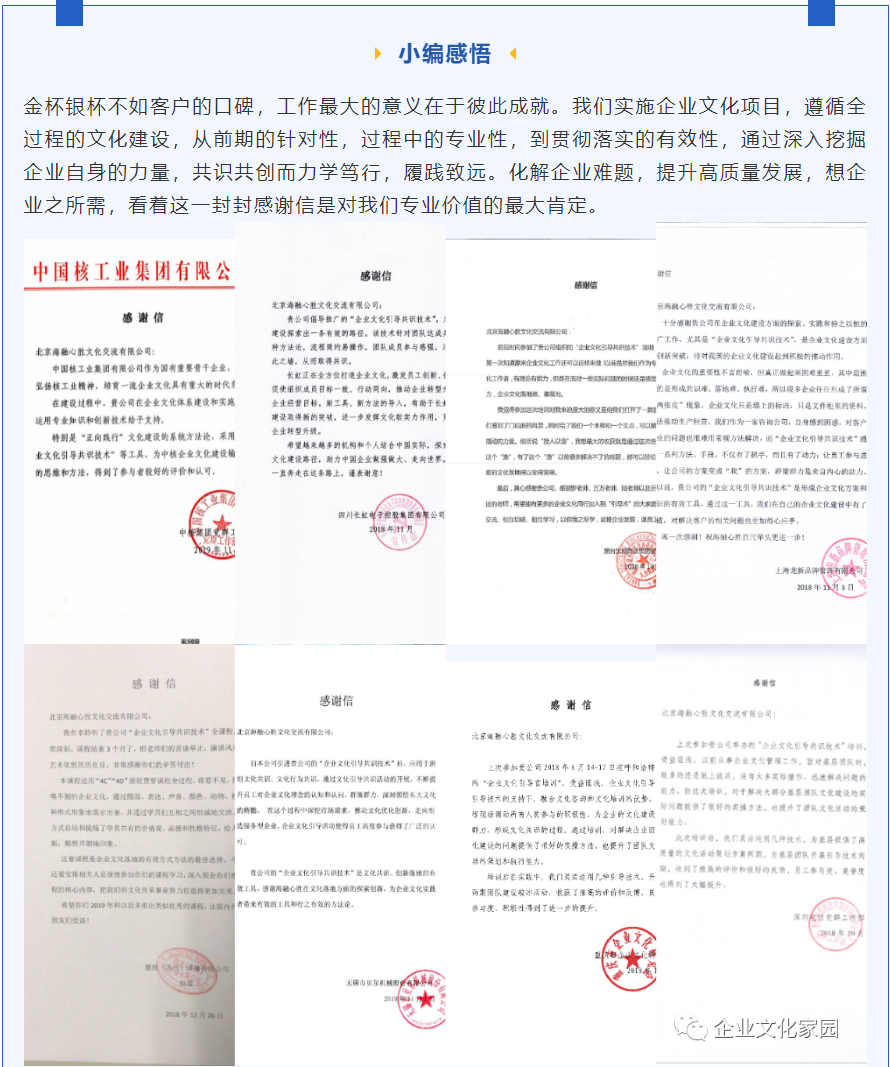 2)老師的文化踐行理念與公司的需求不謀而合——公司不僅僅是想搭建文化體系,更重要的是通過(guò)文化的共識、文化的踐行,提升向心力,提升企業(yè)競爭力。通過(guò)與北京海融心勝老師的反復溝通,我們相信他們能夠做到。接觸老師后,給我印象比較深的幾個(gè)關(guān)鍵詞: