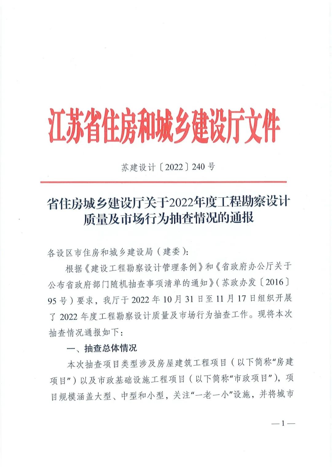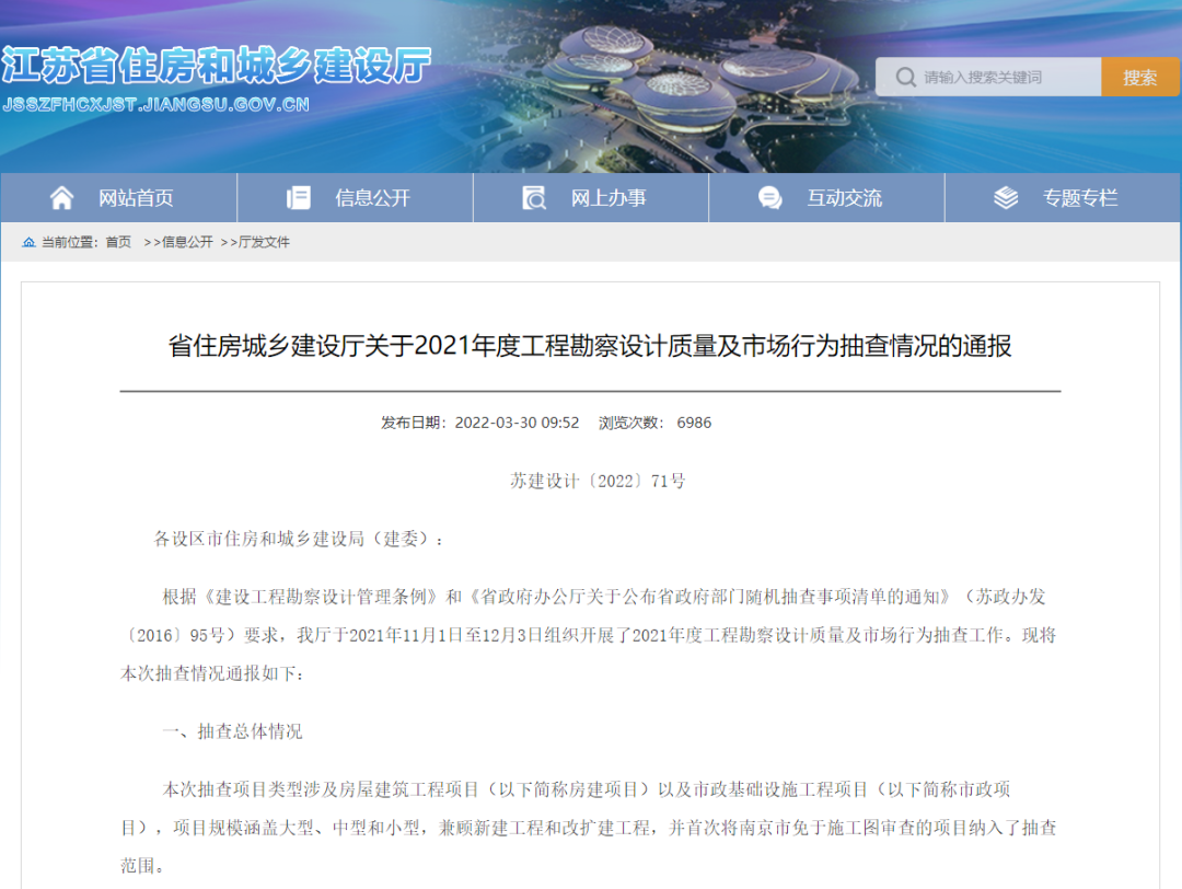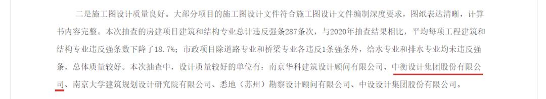 2022年底,江蘇省住房和城鄉建設廳對2022年度工程勘察設計質(zhì)量及市場(chǎng)行為進(jìn)行抽查并發(fā)布通報,在關(guān)系設計企業(yè)的“施工圖設計質(zhì)量”“市場(chǎng)行為規范”兩項中,中衡設計集團股份有限公司均表現良好、獲得肯定。